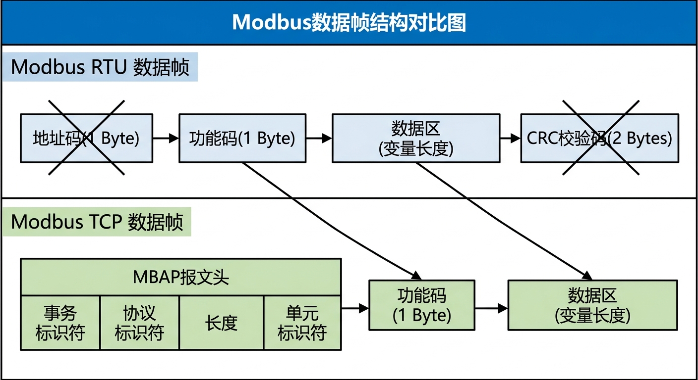 Modbus TCP(现代新贵): 基于以太网(TCP/IP协议)。简单来说,它就是把Modbus的报文“打包”塞进了TCP/IP的数据包里,在网线上跑。