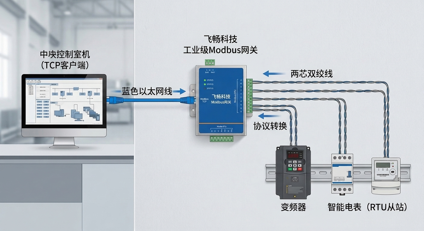 在飞畅科技接触的实际项目中,90%的工厂都是“混合网”:现场有几百块便宜好用的Modbus RTU仪表,而中控室的SCADA系统只认以太网的Modbus TCP。