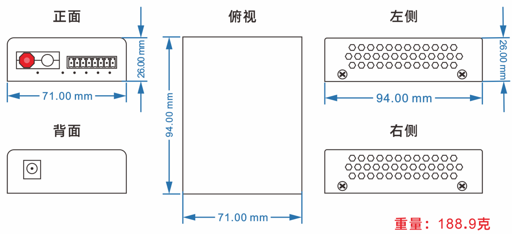 外置电源:94mm(长) x 71mm(宽) x 26mm(高) 内置电源:140(长)*110(宽)*30mm(高) |