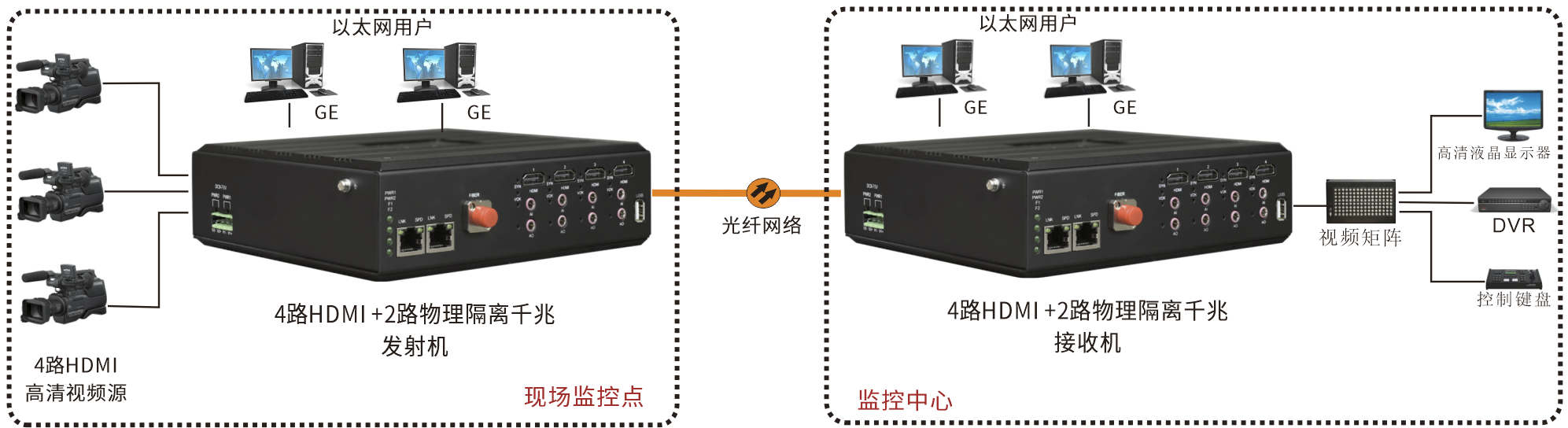 | 产品功能描述 | 在光纤上同时传送4路2K HDMI 信号 + 2路物理隔离千兆以太网+1路USB |