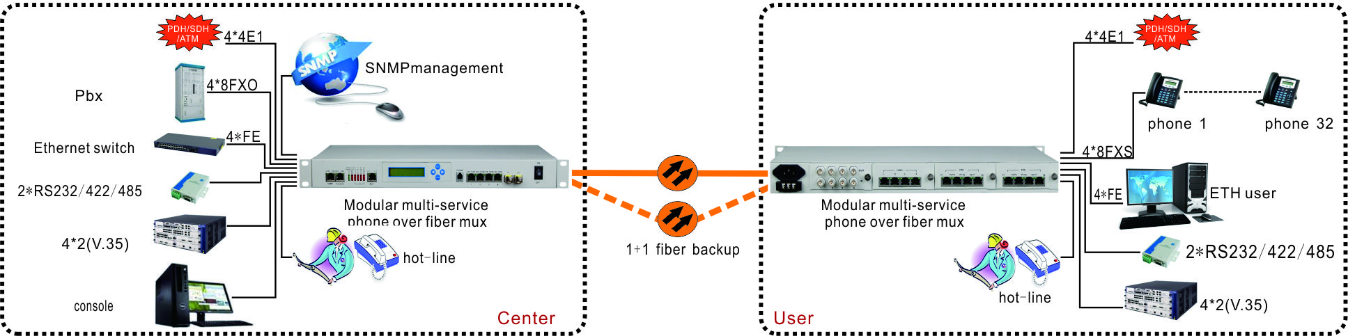 4 slots of tributary with variant plug-in modules which included 4xE1 channels module 4/8/16 x FXO/FXS module and 2x Nx64K V.35 module.The maximum capacity will be up 4 plug-in modules which could be combinations with above modules.The high flexibility performance is the best solution for voice/data/video services in existed market.