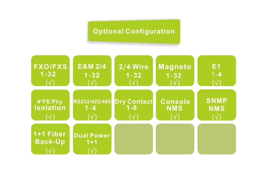 ◆ Voice port to support FXO/FXS/2-4 Wire E&M/2-4 wire Audio/Magnet phone interface,FXO port plug into PBX,FXS port is connected to the user's telephone;