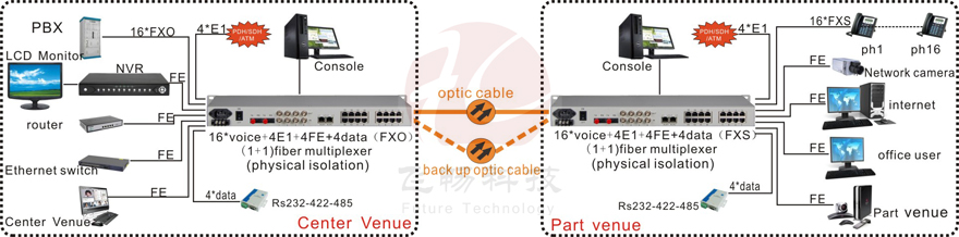 The phone provides 16 telephone Optical 1 to 4 E1 interfaces, 4 physically isolated Fast Ethernet interface (independent bandwidth per line speed 100M), and four expansion business interface. 4 Extended service interface can be used as RS232 / RS485 / RS422 asynchronous data, voice signal, twenty-four wire E & M audio signals, digital signals, transmission channel, the application is very flexible.