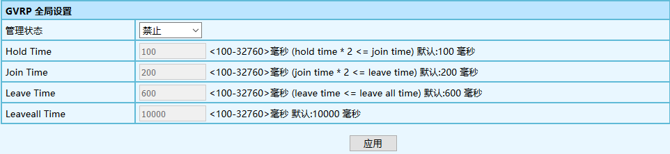 3.如需修改 GVRP 的全局配置,在 GVRP 全局配置框中修改相应配置,然后单击<应用>。