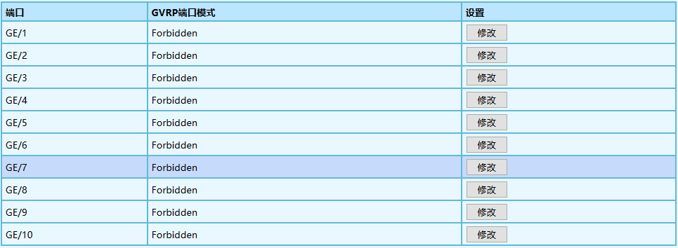 2.在[GVRP 端口设置]界面中可以查看 GVRP 的端口配置,如下图所示。