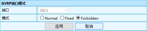 4.如需修改 GVRP 的端口配置,单击指定端口后面的修改按钮,进入 GVRP 端口配置修改界面,如下图所示,,配置好后,然后单击<应用>。