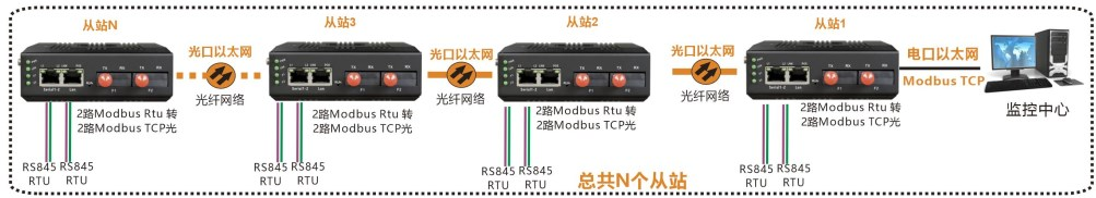 可光纤级连型 2 路 RS232/422/485 串口服务器,2 路光以太+1 路电以太,工业轨式