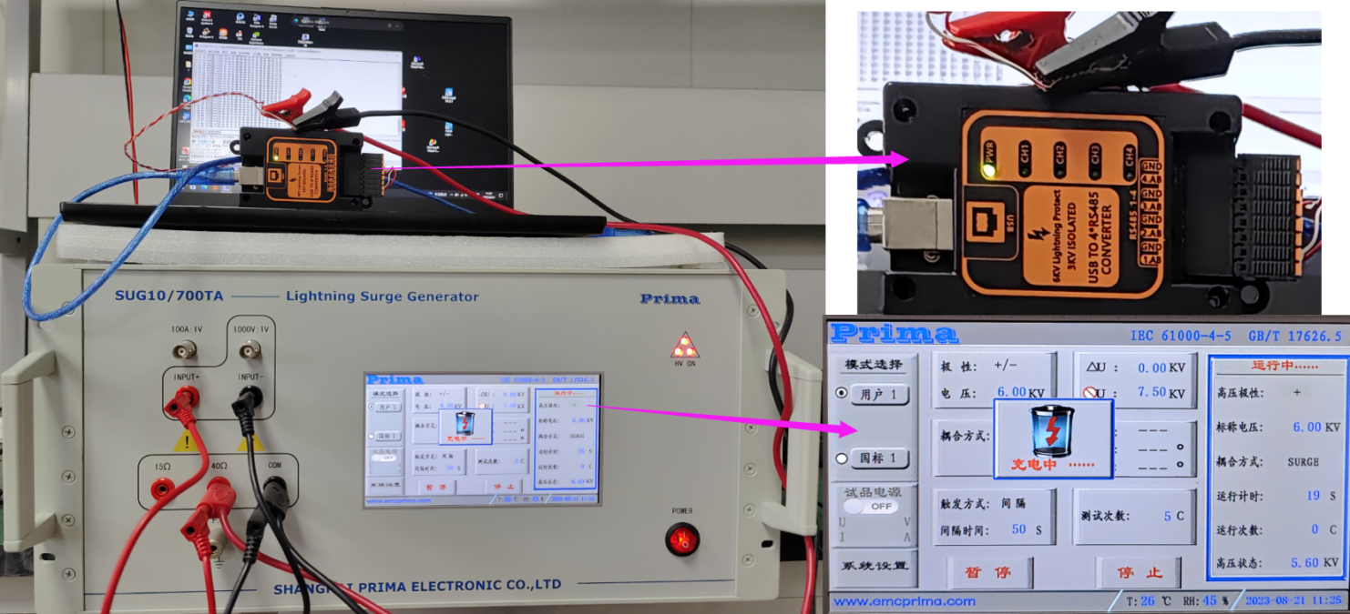 USB直接连电脑雷击测试:4*RS232接口可过:短路电流波10/700μs开路峰值电压6KV内阻40Ω的雷击测试