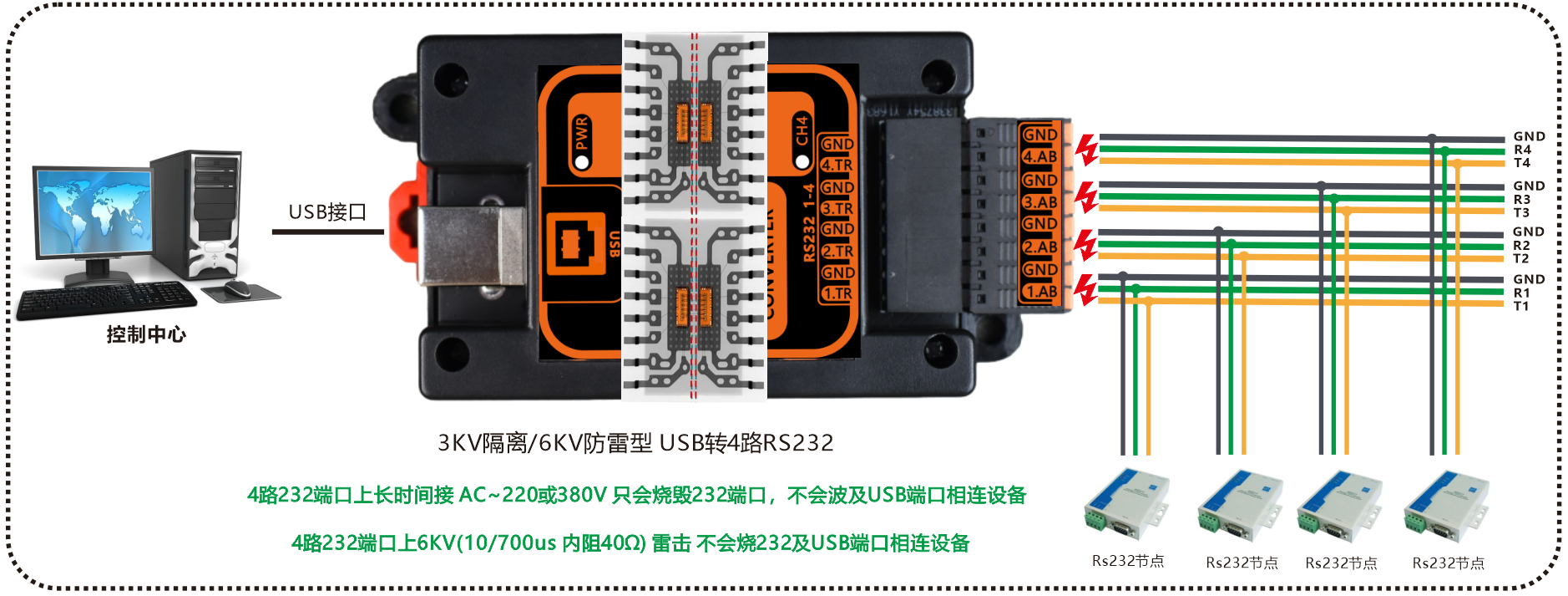 ◆ 4路RS232串口与USB接口带3KV隔离当长时间接入AC~220V或AC~380V高压时只烧RS232接口,不烧USB口及相连设备
