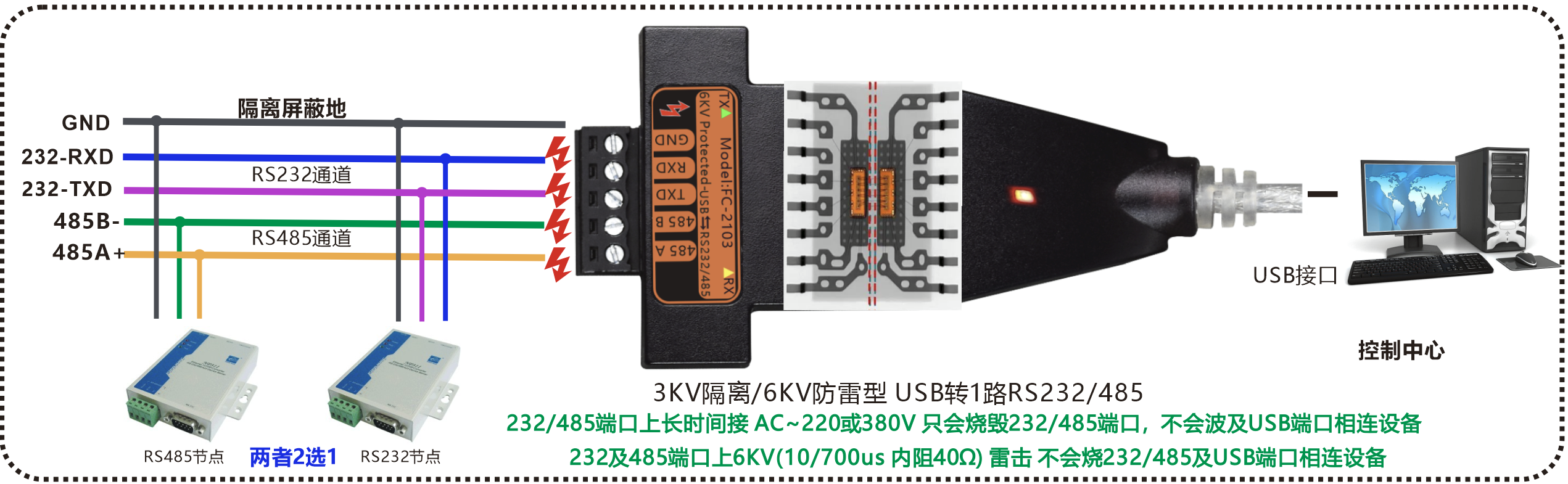 | 产品功能描述 | 防雷隔离型USB转1路S232/485转换器,带USB线 | |||