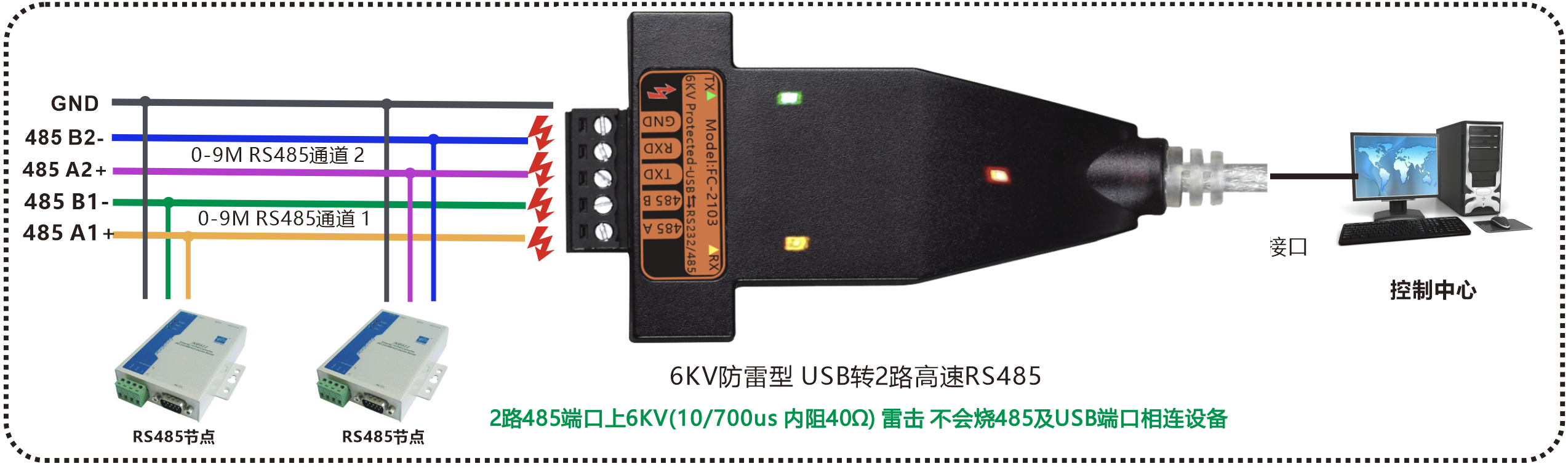 | 产品功能描述 | 防雷型USB转2路RS485转换器,带USB线 |