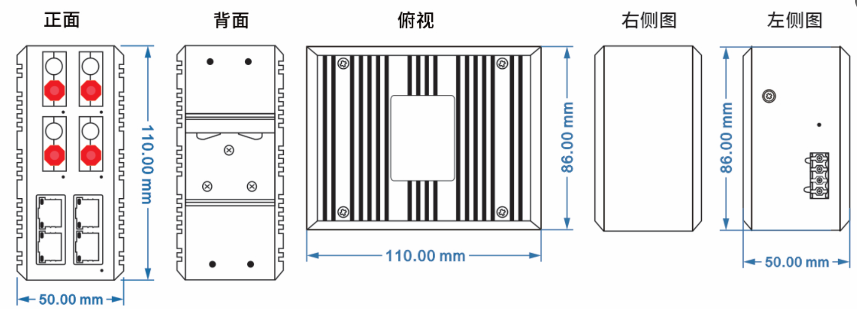 外壳:IP40防护等级,铝合金材质 尺寸:110mm(长) x 86mm(宽) x 50mm(高)(高) 安装方式:导轨安装、壁挂式安装 |