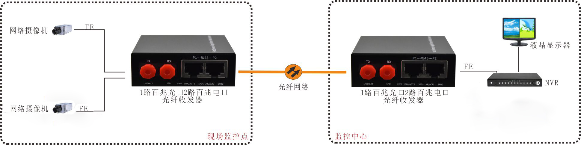 | 产品功能描述 | 1路百兆光口转2路10/100M以太网电口,并共享百兆带宽,外置电源 |