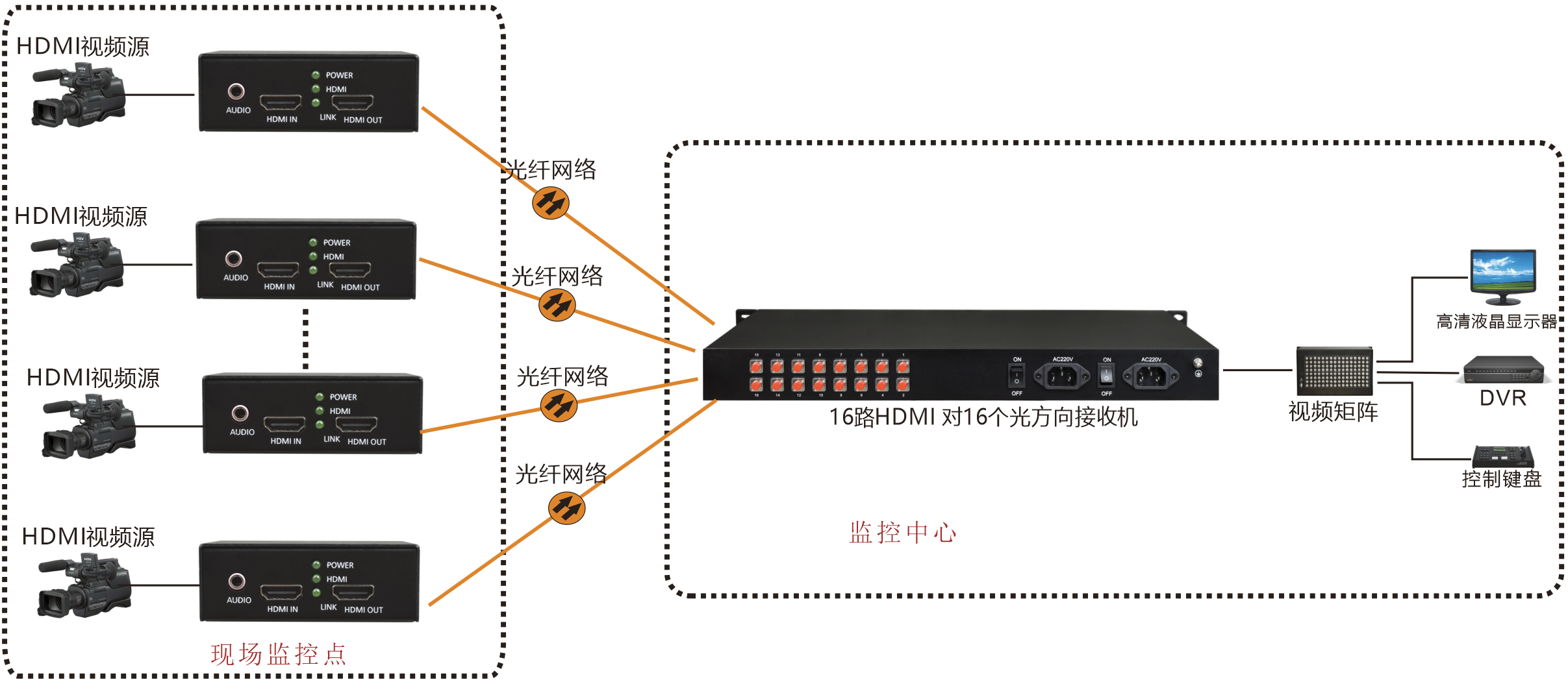 16路2K 高清HDMI光端机支持16路2K分辨率HDMI信号高速视频带宽,对应16个光方向,可以一台设备(HDMI 发射)对应16台HDMI接收机,也可以一台设备(HDMI 接收)对应16台HDMI发射机。