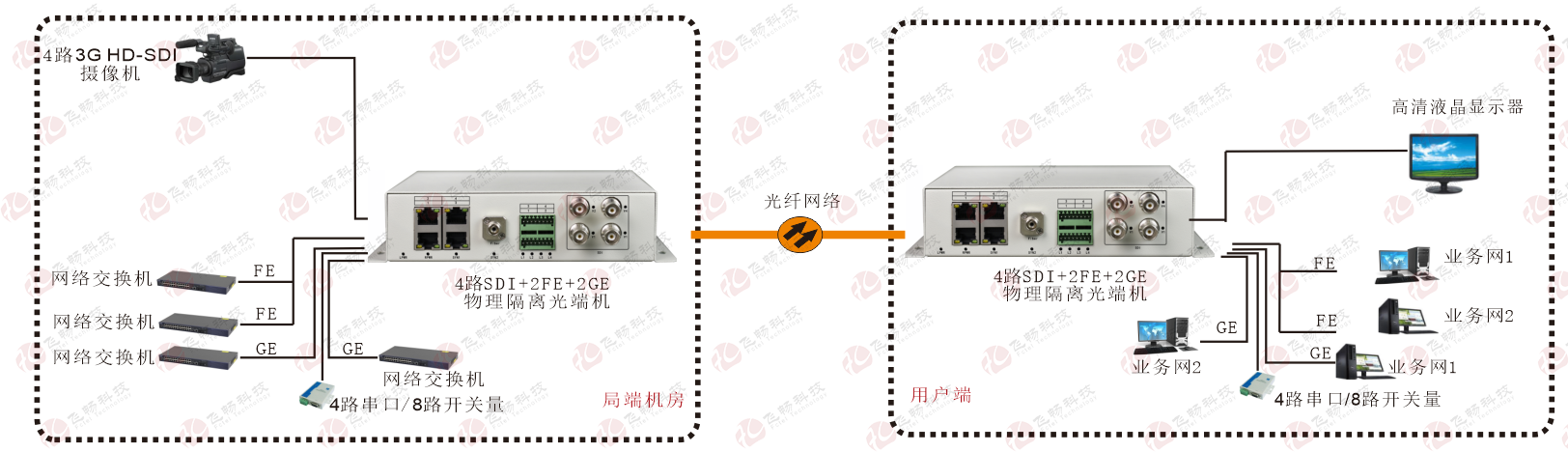 | 产品功能描述 | 在光纤上同时传送4路3G HD-SDI视频,1-8路开关量接口/1-4路RS232-422-485接口;2路千兆以太网(物理隔离),2路百兆以太网(物理隔离) |