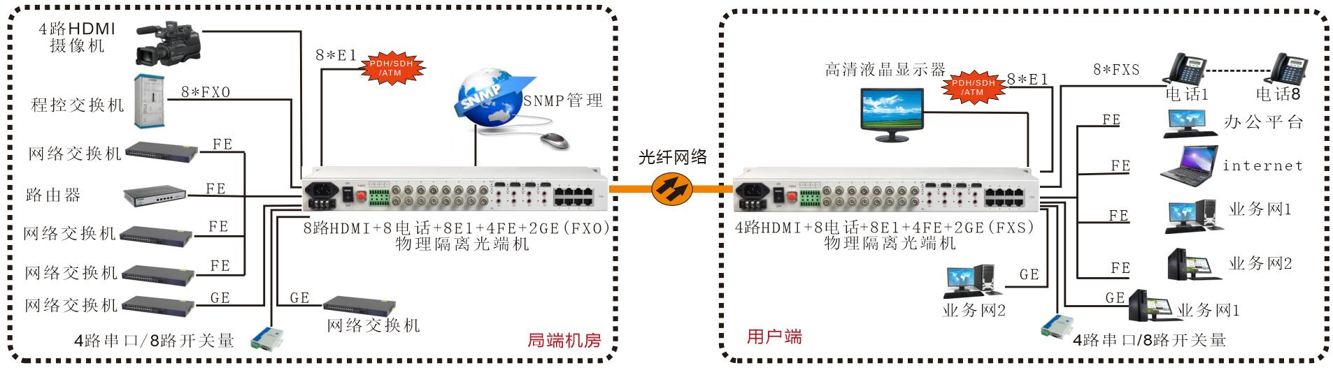 4路HDMI视频+2路千电+4路百电(物理隔离)+8路电话+开关量+串口+E1 光端机